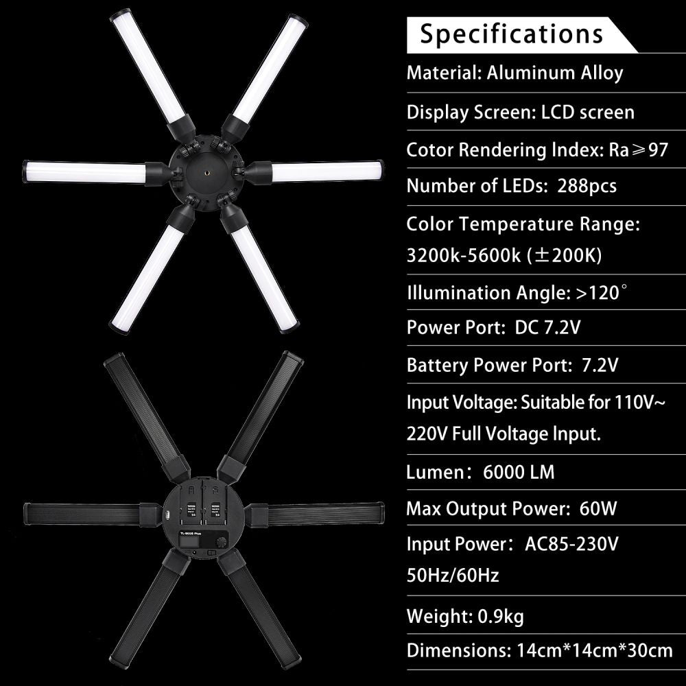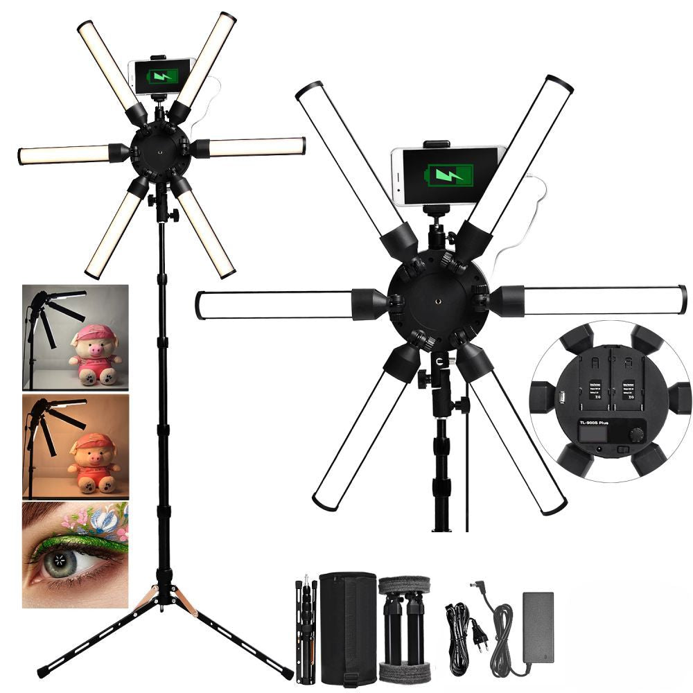 La luz de estrella LED toma el círculo como el centro del diseño de radiación hacia el exterior compuesto por 6 tubos LED, la temperatura del color es de 3200K a 5600K, brillo regulable continuo. Alto CRI 97 con temperatura de color estable. Se pueden instalar dos placas de baterías para satisfacer diferentes necesidades, y las baterías se pueden cargar con el adaptador de corriente sin usar un cargador de batería adicional. (Baterías No incluidas) Puede usar el enchufe USB para cargar su teléfono móvil y otros dispositivos para proporcionar una fuente de alimentación continua. Más conveniente para el vivo y el maquillaje. Se puede utilizar para vídeos en directo, maquillaje de belleza, fotografía de estudio, enseñanza de fotografía y otros campos.